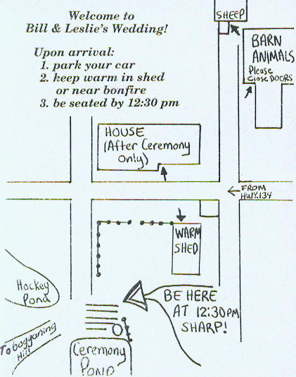 The ceremony will begin at 12:30 p.m., suits and ties are not required or recommended, but snow suits and boots are. Winters are cold at the farm, so expect temperatures from 0 to 20 degrees Celsius. Please bring as much extra clothing as you can carry, you may need it. For the less adventuresome souls, the warm and cozy Hunter Home will be open.