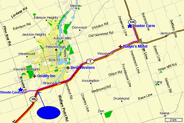 From the Hunter Farm, take highway 134 south (right) to highway 7 west (right). Follow highway 7 to the second set of lights, and turn left onto the divided highway (follow the signs towards Toronto). Follow the divided highway and turn off at the Parkway Exit. Continue straight through the first set of lights (you will be on Sir Sandford Fleming Drive). Then turn right onto Brealey Drive. At the first stop sign, turn left into Sir Sandford Fleming College, and park in the first parking lot on the left.